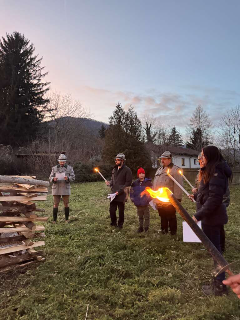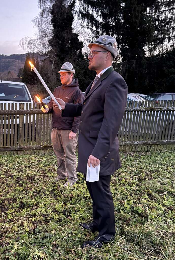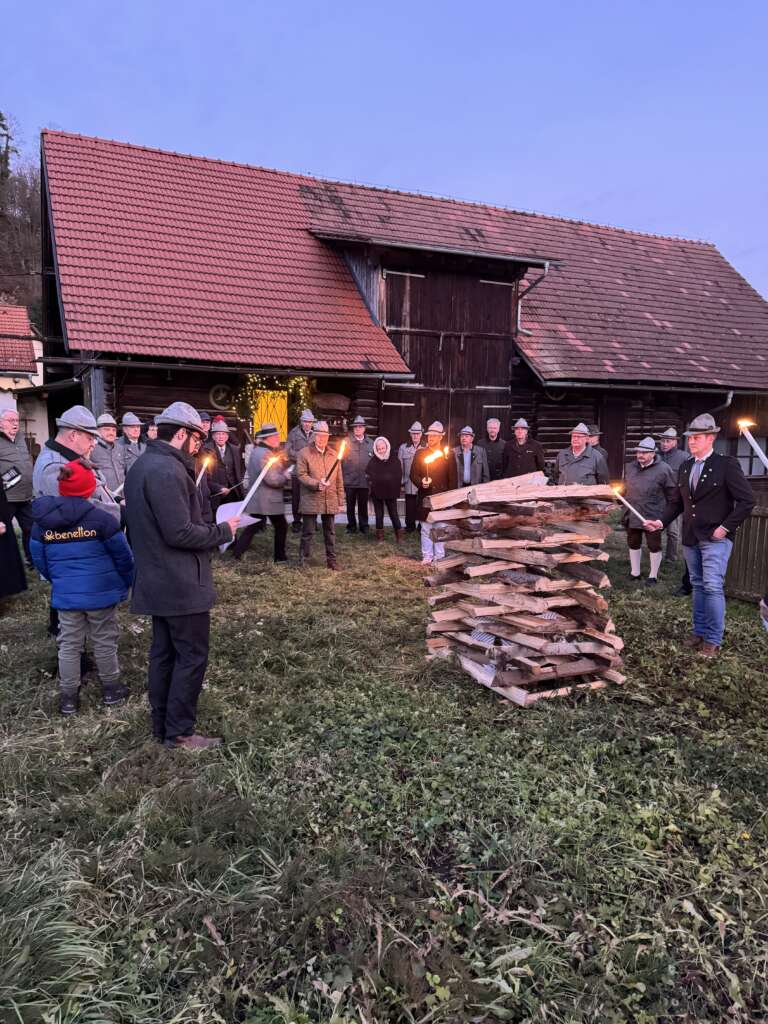 Daraufhin ging es hinaus ins Freie, wo bei besinnlichen und nachdenklichen Feuersprüchen der Feuerstoß mit Fackeln entzündet wurde. Zusammen wurde das Flackern der Flammen beobachtet und das Edelweißlied erklang. Bis in die späten Abendstunden wurde bei Gulasch, Bier und Tee die Kameradschaft gelebt und gepflegt.