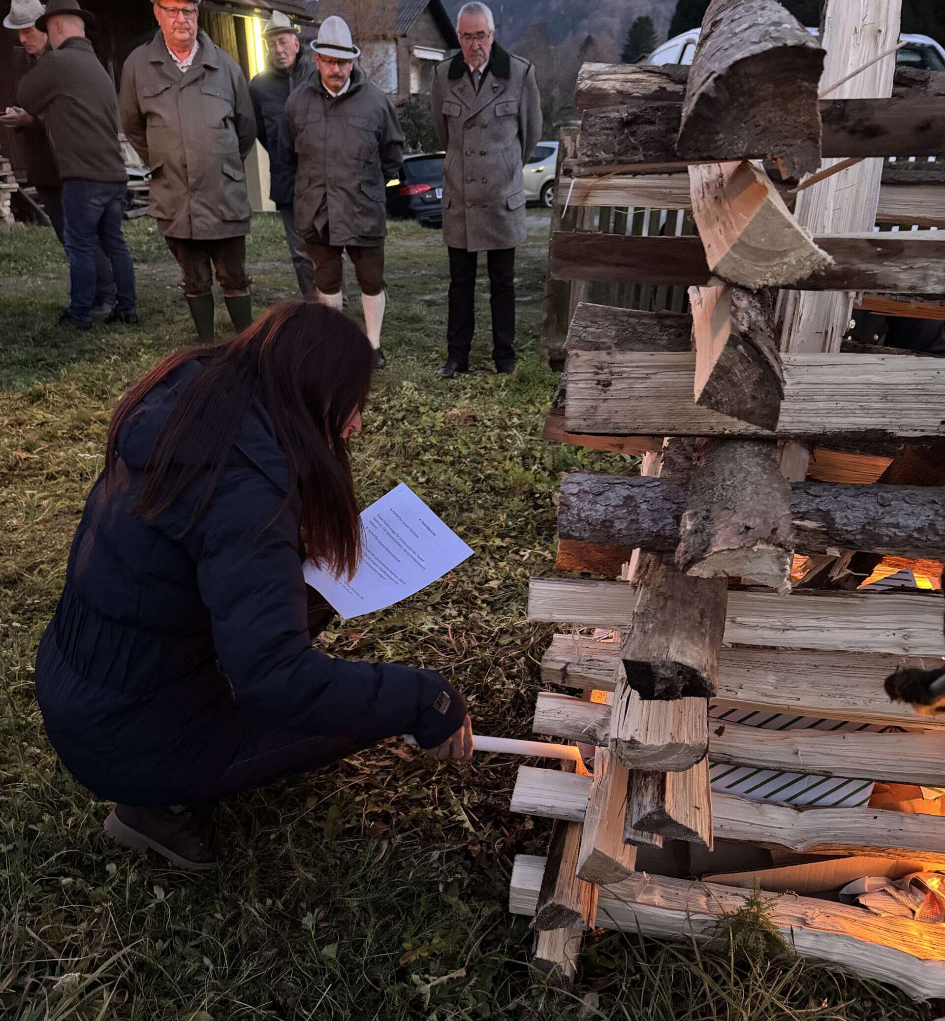 Daraufhin ging es hinaus ins Freie, wo bei besinnlichen und nachdenklichen Feuersprüchen der Feuerstoß mit Fackeln entzündet wurde. Zusammen wurde das Flackern der Flammen beobachtet und das Edelweißlied erklang. Bis in die späten Abendstunden wurde bei Gulasch, Bier und Tee die Kameradschaft gelebt und gepflegt.
