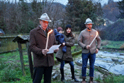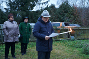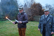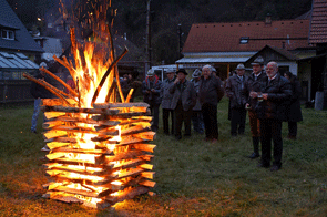 Die Wetterlage mit Hochnebel, Luftfeuchtigkeit und Kälte sowie die entschuldigte Abwesenheit des LVO, des Protektors und anderer Kameraden des Führungskreises des Landesvorstandes trübten anfangs die Wiedersehensfreude. Erst als der 1. LVO-Stv RgR Holger Bibulich die Anwesenden nach Bildung eines Kreises um den errichteten Holzstoß und entzünden der Fackeln begrüßte und den Ablauf der Feier erklärte, kam etwas Stimmung auf. Kamerad Bibulich verwies auf die krankheits- bzw. berufsbedingte Abwesenheit von Kameraden.