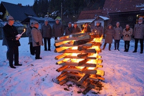 Im Anschluss an die Begrüßungen trugen vier Fackelträger ihre Feuersprüche vor und entzündeten den Holzstoß symbolisch an allen vier Himmelsrichtungen mit Kerzenfackeln. Bald loderten die Flammen in den Himmel und alle blickten sinnend in das Feuer und hingen ihren Gedanken nach. Der gf LVO rief im Feuerschein des Holzstoßes den Landes-Webmaster zu sich und überreichte ihm in seiner Eigenschaft als Obmann des Stadtverbandes Graz eine Dankesurkunde für die geleisteten Unterstützungen im EDV-Bereich.
