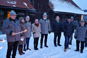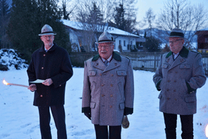 Nach dem Eintreffen aller Teilnehmer im Edelweißheim wurde ins Freie verlegt und vor dem vorbereiteten Holzstoß, der diesmal schon brannte, im Halbkreis gesammelt. Der 1. LVO-Stv Obst aD RgR Holger Bibulich, der derzeit die Leitung des Landesverbandes innehat, begrüßte alle angereisten Kameradinnen und Kameraden auf das Herzlichste. Er ging auf die Bedeutung der Wintersonnenwende ein, wo wir uns alle bald wieder auf längeres Tageslicht freuen können. Danach wurden wir in Vertretung des OV Obmannes Deutschfeistritz-Peggau, Kurt Mirtschin, von einem Kameraden begrüßt und willkommen geheißen.
