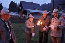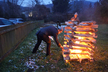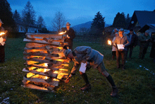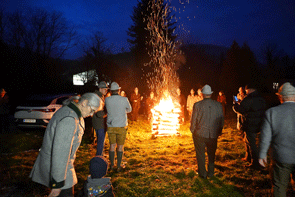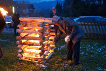 Anschließend wurde ins Freie verlegt, wo vor dem Edelweißheim bereits der vorbereitete Holzstoß auf das Entzünden wartete. Es wurden Fackeln entzündet und ein Halbkreis gebildet. Zu vier Feuersprüchen wurde von vier Kameraden der Holzstoß an vier Seiten angezündet und bald darauf loderte der Holzstoß in voller Pracht.