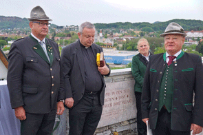 Mit dem Edelweißlied, gespielt von der Artillerie-Traditionskapelle Von der Groeben, endete der Festakt am Denkmal und es wurde wieder zum Wirtshaus Billek marschiert. Vom Landesverbandsobmann Bgdr i.R. Josef P. Puntigam erhielten Stadtrat Manfred Promitzer und der Ortsobmann der Kameradschaft vom Edelweiß Feldbach Johann Reinprecht eine Ehrenurkunde um die Verdienste der Erhaltung des Denkmals. Horridoh K.B. |