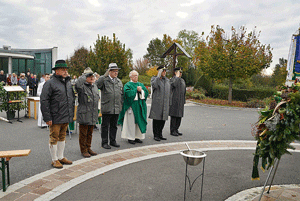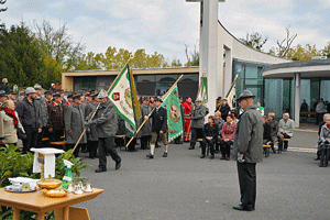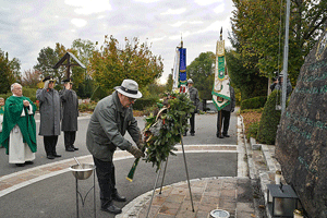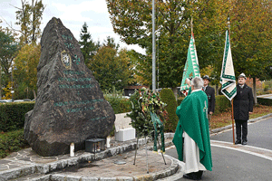 Der Fahneneinzug der Kameradschaftsverbände und das Hissen der Rot-Weiß-Roten Fahne eröffneten den Festakt. Am Gedenkstein wurde als Zeichen des Gedenkens ein Kranz niedergelegt und vom Pfarrer Mag. Bernhard Preiß gesegnet.