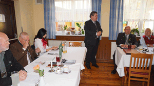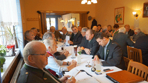 Gerade rechtzeitig zum Abschluss seiner Ausführungen traf der geladene Bürgermeister von Kirchberg a. d. Raab, Florian Gölles, ein und erhielt sofort die Ehre des Wortes. Er bedankte sich bei unserer Kameradschaft, im Besonderen beim Ortsverband Kirchberg a. d. Raab, für das unermüdliche Auftreten in der Öffentlichkeit und das Eintreten für Heimatverbundenheit und gelebte Kameradschaft, vor allem auch für die langjährige Durchführung der Flaggenparade am Edelweißgedenkstein. Da noch eine Sitzung für ihn als Bürgermeister anstand, verließ uns Bgm Gölles nach seinen Grußworten, um am Abend bei der Flaggenparade wieder in unseren Kreis einzutreten. Als weitere Tagesordnungspunkte wurden die Berichte der Ortsverbände, des WebMasters, des Landespressereferenten und der Landesschriftführerin ausgeführt sowie die Termine für 2015 akkordiert. Als Höhepunkt der Sitzung erhielten die Anwesenden Hintergrundinformationen zur Bundesheerreform vom LVO. Auch der Stadtamtsdirektor von Fürstenfeld, unser Kamerad Mag. Willi Göber, referierte kurz über die vollzogenen Gemeindezusammenlegungen und bezog Stellung zur Sicherheitssituation in unserem Staat.