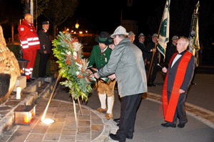 Gedacht wurde der im Krieg gefallenen Kameraden, Frauen und Kinder. Den Festakt eröffnete der Landesverbandsobmann der Kameradschaft vom Edelweiß Bgdr i. R. Josef P. Puntigam. Der Obmann des OV begrüßte die Gäste und bat den Bürgermeister um seine Grußworte. Der Bürgermeister nahm Stellung zu den damaligen Ereignissen und zitierte danach auf den Nationalfeiertag gerichtet die Ansprache von Leopold Figl nach der Unterzeichnung des Staatsvertrages vom 15. Mai 1955 – Österreich ist frei.