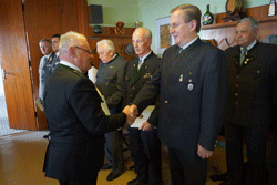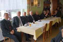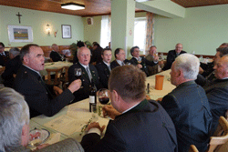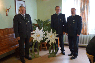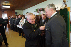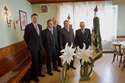 Nach der Neubestellung des Landesvorstandes wurde das Mittagessen eingenommen. Nachdem mittlerweile die geladenen Ehrengäste eingetroffen waren, wurde der zweite Teil um 13:30 Uhr durch den LVO eröffnet, in dem er die Ehrengäste, nach dem Einzug der Fahnen zum Edelweißlied, begrüßte. Darunter als Vertreter der wehrpolitisch relevanten Vereine der Präsident der steirischen Offiziersgesellschaft, GenMjr Mag. Heinrich Winkelmayer, der Präsident der steirischen Unteroffiziersgesellschaft, Vzlt Othmar Wohlkönig und den Vizepräsidenten des steirischen Kameradschaftsbundes, Franz Ortauf. Die Einsatzorganisationen wurden vertreten durch den Polizeichef des Bezirkes Südoststeiermark, Obstlt Herbert Karner, die Kommandanten des JgB 17, Obstlt Bernhard Köffel, des stellvertretenden Kommandanten des AAB 7, Mjr Manfred Scheucher und den Chef der hiesigen Feuerwehr, HBI Manfred Seidl. Die Vertreter der Politik wurden angeführt vom Bezirkshauptmann des Bezirkes Südoststeiermark, HR Dr. Alexander Majcan. Gekommen waren auch die Bürgermeister von Frutten-Gießelsdorf, Josef Großschädl und der Bürgermeister von St. Anna am Aigen, Hannes Weidinger. Besonders begrüßt wurden auch Vater Markus und Sohn Kajetan Lindmayer, die den Festakt am E-Piano untermalten. Nach der Begrüßung wurde nicht nur den im abgelaufenen Jahr verstorbenen Edelweißmitgliedern gedacht, sondern aller in den Weltkriegen Gefallenen. Im Anschluss hielt unser LVO die Laudatio zu 60. Jahre Edelweiß, von der Gründung bis zum heutigen Tag und brachte zum Ausdruck, dass er sehr stolz auf unsere Kameradschaft sei. Ein weiterer erfreulicher Akt war die Angelobung der Gattin des Webmasters, Christine, als ordentliches Mitglied der Kameradschaft vom Edelweiß, die vom LVO und Peter Paul Pergler vorgenommen wurde. Als absoluter Höhepunkt gestaltete sich die Ehrung und Auszeichnung verdienter Kameradinnen und Kameraden unseres Verbandes. So kann sich unser Ortsverband über die Auszeichnung unserer Kameraden, Ehrenobmann Fritz Pfleger mit einer Ehrenurkunde, unseres Fahnenoffiziers Josef Grain mit dem Ehrenkreuz in Silber und unseres Pressereferenten Kurt Bübl mit dem Ehrenkreuz in Silber, freuen.