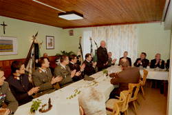 Auch unser Landesverbandsobmann Josef Paul Puntigam erhielt, aus den Händen seines 3. Stellvertreters Kurt Mirtschin, eine Ehrenurkunde für sein jahrzehntelanges, unermüdliches Wirken, beurkundet durch die gesamte Kameradschaft vom Edelweiß. Nach einem Musikstück hatten alle vom LVO aufgeforderten Ehrengäste die Ehre des Wortes, indem sie ihre Grußbotschaften überbrachten. Der offizielle Teil wurde nach den Dankesworten des LVO durch den Auszug der Fahnen zum Lied „Wahre Freundschaft soll nicht wanken“ beendet. Danach wurde in kameradschaftlicher Runde zu ein paar guten Tröpferln südoststeirischen Weines zusammen gesessen.