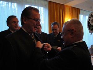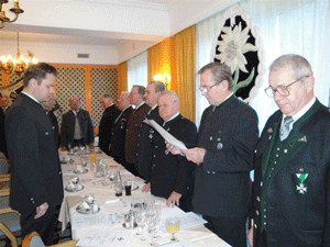 Den fünf anwesenden Neumitgliedern wurde vom Landesverbandsobmann das Verbandsabzeichen der Kameradschaft vom Edelweiß angesteckt. Vom neuen Vorstand wurde Kamerad Fritz Pfleger für seine besonderen Verdienste um den Ortsverband zum Ehrenobmann ernannt. Vom Webmaster Vzlt Franz Kerschbaum erhielt Kurt Bübl als Anerkennung seiner bisherigen Tätigkeit als Pressereferent des Ortsverbandes ein graviertes Etui mit eigens angefertigten Edelweiß-Visitenkarten. Mit dem traditionellen Edelweißlied endete die offizielle Veranstaltung und es wurde zum gemütlichen Teil des Tages übergegangen. <<mehr Fotos>>