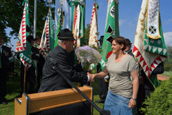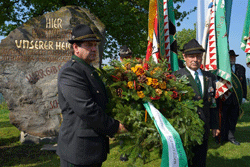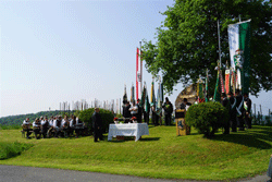 Nach dem Einmarsch der Fahnenabordnungen folgte die Kranzniederlegung am Gedenkstein. Den Grußworten der Ehrengäste schloss sich die Feldmesse mit musikalischer Untermalung an und als Dank für die Pflege des Gedenksteines übergab der ÖKB einen Blumenstrauß.