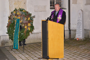 Totengedenken vor der Gedächtnisstätte am Turmplatz in Feldbach.