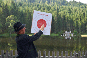 Unser Landesverbandsobmann Bgdr iR Josef Paul Puntigam lud Mitglieder aller Ortsverbände, die sich um die Kameradschaft, Verbandspflege und Mitarbeit innerhalb unserer Edelweißkameradschaft wie auch der Repräsentation nach außen besonders verdient gemacht hatten am 10. September 2016 zum Wasserschießen am Schattensee nach Krakauschatten bei Murau ein. Erkundet, angemeldet und organisiert wurde diese Aktion von unserem Kameraden Vzlt iR Karl Zanner. Am Ort der Durchführung auf einer Lichtung im Wald angekommen standen wir staunend vor einem See wo sich der Schießstand befindet und sich die Schießscheiben im Hintergrund im See spiegeln.