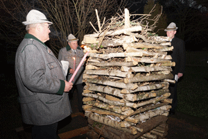Zum schon traditionellen Holzstoßanzünden mit den vier Fackeln versammelten sich alle Teilnehmer um den Holzstoß. Vier Kameraden trugen vor dem Anzünden des Holzstoßes einen Feuerspruch vor. Mit dem Edelweißlied endete diese feierliche Zeremonie. Danach lud der Ortsverband die Kamerad/Innen noch zum Essen, Trinken und Kameradschaftspflege ein. Für Schmankerln wie Kekse aller Art sorgten die fleißigen Frauen der Kameraden.