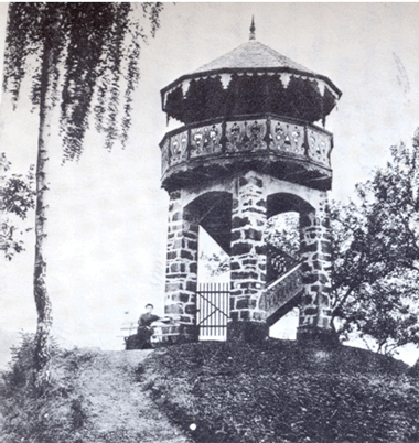 „Parapluie“ (Nach einer Fotografie aus dem Jahre 1920) Aussichtswarte auf der Albrechtshöhe, erbaut im Jahre 1840. Im Jahre 1984 wurden der Holzbau und Teile des Mauerwerkes durch die Kameradschaft vom Edelweiß neu errichtet. Im Jahre 2000 erfolgten die zweiten großen Renovierungsarbeiten und im Anschluss die Einweihung dieses Kleinods. Dem um 1840 auf der Albrechtshöhe (Wierberg) in Bad Gleichenberg aufgestellten, oft genannten Aussichtsturm „Parapluie“ lagen mit Sicherheit Pläne von FML Baron von WELDEN zugrunde.