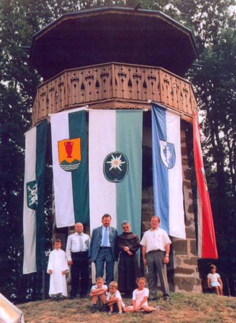 Die Bürgermeister v. li. n. rechts: Bgm. Kam. Ing. Rudolf LOOS aus Bad Gleichenberg mit LAbg. Bgm. Franz SCHLEICH aus Bairisch Kölldorf mit Pater SIEGFRIED und Obmann Fritz PFLEGER anlässlich der zweiten Renovierung und der danach erfolgten Einweihung der Parapluie-Warte im Jahre 2001. |