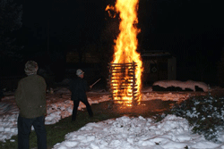 Wie es zur vorweihnachtlichen Zeit dazugehört wurden Gedichte vorgetragen und die Kerzen des Adventkranzes nach Verlesung von Kerzensprüchen angezündet. Musikalisch untermalt wurde die Feier von einem Kameraden aus Strass, der auf seiner Trompete weihnachtliche Weisen spielte. Landesobmann Josef Paul Puntigam hielt die Festrede zum Thema Weihnachtsbrauchtum und zu aktuellen Vorkommnissen der letzen Zeit. Im Anschluss an die Rede wurden alle gebeten mit nach draußen zu gehen um den Holzstoß zu entzünden. Wie es zum Brauchtum dazugehört wurden vier Feuersprüche verlesen und 4 Kameraden entzünden mit Fackeln den Feuerstoß. Die Flammen loderten alsbald zum sternenklaren Himmel und spendeten Licht und Wärme.