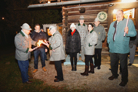 Nachdem auch unser LVO die Anwesenden begrüßt hatte, folgten ein Weihnachtsgedicht mit einer anschließenden Gedenkminute und die Verlesung der verstorbenen Kameraden dieses Jahres. Feierlich wurden danach die Kerzen auf dem Adventkranz entzündet, begleitet von vier Kerzensprüchen. Beim anschließenden, von allen gesungenen „ Es wird schon glei dumpa“, konnte leider kein Song Contest gewonnen werden. Danach schritt man zum Höhepunkt der Feierstunde und es ging ins Freie. Fackeln wurden angezündet und der vorbereitete Holzstoß mit vier Fackelsprüchen unter Aufsicht der Feuerwehr entzündet. Auch hierzu wurden vier Feuersprüche verlesen, wobei von allen vier Himmelsrichtungen Feuer gelegt wurde. Bald brannte der Holzstoß lichterloh und alle Versammelten blickten gedankensversunken in die Flammen.
