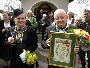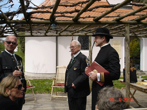 Die besonderen Glückwünsche unseres Ortsverbandes wurden in Form einer Ehrenurkunde übergeben. Josef Paul Puntigam bedankte sich seinerseits bei allen Festgästen für ihr Kommen und bat die Festgesellschaft in den Buschenschank Neubauer, wo bereits ein wunderbares südoststeirisches Hochzeits-Bergler-Essen wartete.