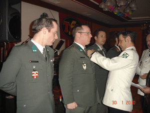 Die Tanzband Top Five übernahm nunmehr das Kommando und erklärte den ersten Walzer zur Damenwahl, worauf sich die Tanzfläche sehr schnell füllte. Der Ballsaal war wieder liebevoll in Gebirgs- und Fallschirmjägertradition dekoriert, die Stimmung ausgelassen und heiter und so nahte ein weiterer Höhepunkt dieses Balles recht rasch. Vier Kameraden des Militär Fallschirmspringer Verbundes Ostarrichi konnten vor dieser würdigen Kulisse ihre Fallschirm-springerabzeichen entgegen nehmen und diese erstmalig stolz der Öffentlichkeit präsentieren. Nach dieser Zeremonie wurden alle anwesenden Fallschirmspringer auf die Tanzfläche gebeten und gemeinsam wurde das Fallschirmjägerlied gesungen.