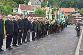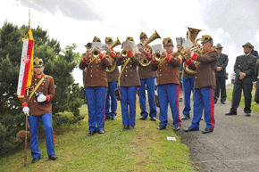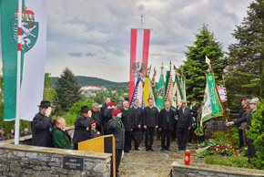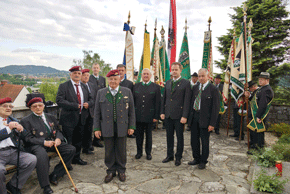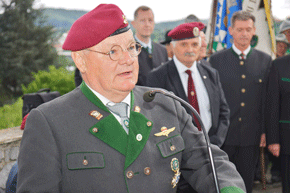 Nach einem Choral und dem Edelweißlied, gespielt von der Artillerie-Traditionskapelle Von der Groeben, begrüßte unser LVO die zahlreich erschienenen Vertreter des öffentlichen Lebens und der Geistlichkeit, Kameraden der Einsatzverbände, des ÖKB und natürlich der Kameradschaft vom Edelweiß mit ihren Fahnenabordnungen. Aus dem fernen Wien waren wie alle Jahre die Vertreter des Bundes ehemaliger Fallschirmjäger angereist, darunter die letzten einsatzerfahrenen und bereits hoch betagten ehemaligen Fallschirmjäger Altbürgermeister Karl Deutschmann aus Feldbach und Kamerad Franz Wolf aus Graz. So waren über 100 Menschen angetreten um wieder wie jedes Jahr an diesem Ort der gefallenen Kameraden und Opfer unsinnigen Völkerringens, aber auch unserer Republik und der Wiederaufbaugeneration zu gedenken.