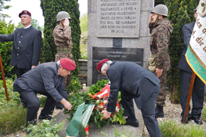 Nach dem Vortrag von Gedichten zum feierlichen Anlass und den Grußbotschaften der Ehrengäste hielt unser Generalvikar i.R. Monsignore Anton Schneidhofer eine Feldmesse, worauf im Anschluss die Kränze der Edelweiß- und Fallschirmkameraden zum Lied des guten Kameraden am Ehrenmal niedergelegt wurden. Dazu ertönten die Salutschüsse der Kanone des ÖKB-Ortsverbandes Tieschen und kündeten der Umgebung weithin mit lautem Hall, dass wieder der gefallenen Kameraden und Opfer unsinnigen Völkerringens gedacht wird. Mit dem Fallschirmjägerlied und den anschließenden Dankesworten des LVO endete die Gedenkfeier am Ehrenmal.