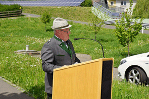 MilOKurat Mag. Sascha Kaspar hielt im Anschluss eine kurze Feldandacht und zum Lied vom Guten Kameraden wurde aller Verstorbenen und Gefallenen der Kriege gedacht. Begleitet wurde das Gedenken von drei Salutschüssen der Festschusskanone des ÖKB Tieschen. Mit dem Gedicht Die Schuhe des Soldaten wurde durch Herma Puntigam auf den folgenden Ablauf eingestimmt. Die Laudatio durch den Landesverbandsobmann folgte danach und nach dem Prinz Eugenmarsch hatten die Ehrengäste die Ehre des Wortes.