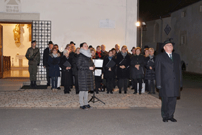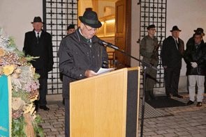 Nach erfolgter Aufstellung der Abordnungen vor der Kirche hielt Dechant Mag. Friedrich Weingartmann in ergreifender Weise die Gebete zum Totengedenken.Musikalisch unterstützt wurde er vom Gesangsverein Feldbach. Nach dem „Gebet zur Schlacht“, intoniert von der Jungsteirerkapelle Feldbach, hielt der Obmann des StV Feldbach, ÖkR Karl Buchgraber, seine Ansprache zum Totengedenken.