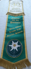 Die Edelweiß-Fahne weht in stolzer Pracht, das hat unserer Feier besonderen Glanz gebracht. Wir Patinnen freuen uns sehr und danken dafür, dass wir sie heute schmücken dürfen mit neuer Zier. Neigt sie nieder, dass wir mit unserer Hand, dürfen knüpfen an diese Fahne das neue Fahnenband. Es soll für Verbundenheit steh´n, damit wir in Eintracht und Frieden durch unser Leben geh´n.