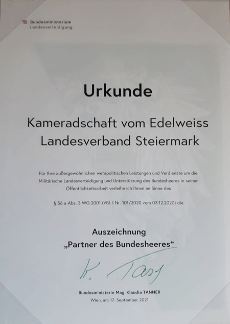 Am 17. September 2021 wurde der Kameradschaft vom Edelweiß durch das BMLV die Auszeichnung „Partner des Bundesheeres“ verliehen. Die feierliche Überreichung der Partnerschaftsurkunde erfolgte im Zuge eines Festaktes durch den Militärkommandanten von Steiermark, Bgdr Mag. Heinz Zöllner, an den ersten Landesverbandsobmann-Stellvertreter, Obst aD RgR Holger Bibulich, der gemeinsam mit Bgdr iR Josef Paul Puntigam zu diesem Anlass in die Belgier-Kaserne geladen war.