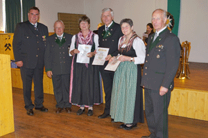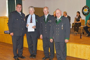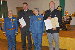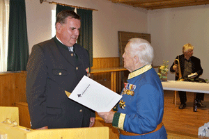 Vor den Schlussworten des Obmannes ergriff überraschender Weise der Kurator des ÖSK, Herr Vzlt i.R. Peter Bärnthaler das Wort und zeichnete im Namen des Präsidiums des ÖSK zwei Funktionsträger der Kameradschaft vom Edelweiß in Anerkennung und Würdigung ihrer hervorzuhebenden, besonderen Leistungen um die Kriegsgräberfürsorge sichtbar aus. - WebMaster Kam. Vzlt Franz Kerschbaum wurde das Ehrenkreuz des Österreichischen Schwarzen Kreuzes und - Ortsverbandsobmann Kam. Vzlt i.R. Alfred Stadlhofer wurde das Große Ehrenkreuz des Österreichischen Schwarzen Kreuzes verliehen. In seinen Schlussworten bedankte sich der Obmann bei allen Personen und Persönlichkeiten die zu dieser Feier, aber auch für die Leistungen der vergangenen Jahre all jener Kameradenfrauen und Kameraden, die zu einem funktionierenden Ortsverband beigetragen hatten. Ein besonderer Dank ging an Kam. Thomas Kastl, der mit einigen Kameraden seiner Dienststelle das Mahnmal des Friedens wieder gepflegt und mit einem neuen Anstrich versehen hatte. Ein großer Dank ging an unseren Kameraden, Herrn LAbg. Marco Triller, BA der die Kosten der Verschönerung übernommen hatte. Weiterer Dank wurde den Damen und Herren des Trachtenvereines Steirerherzen unter ihrem Obmann Johann Leicht für die Gastfreundschaft und schöne Gestaltung des Festsaales und dem Quartett der Stadtkapelle Kapfenberg unter der Leitung von Hr. Siegfried Gass für die musikalische Umrahmung dieser Jubiläumsfeier ausgesprochen.