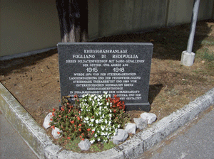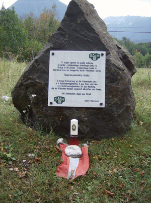 Danach verließen wir Italien und fuhren über Karfreit (Kobarid) in das obere Isonzotal (zu deutsch: Sontig – Tal, slowenisch: Soca) nach Flitsch (Bovec), wo wir an einem Gedenkstein für die im 1. Weltkrieg in diesem Frontabschnitt eingesetzten steirischen Regimentern, nämlich dem kuk Schützenregiment 3 aus Graz und dem kuk Schützenregiment 26 aus Marburg, wieder eine Kerze anzündeten.