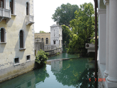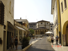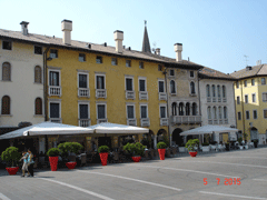 Nach einer Erfrischungsphase trafen wir uns im Speisesaal zum Abendessen, wo uns der nächste Genusshöhepunkt schon erwartete. Zu Wein, Wasser, Grappa und anderen süffigen Dingen wurde uns eine Vielzahl an Antipasti serviert, bis endlich als Höhepunkt der Menüfolge am offenen Feuer im Speisesaal gegrilltes Geflügel, Schwein und Kaninchen serviert wurde. Nach gut zweistündigem „Abendessen“ wurde noch lange in kameradschaftlicher Runde zusammen gesessen und wir ließen den Tag Revue passieren. Erst spät bezogen auch die sitzfestesten Kameradinnen und Kameraden ihre Zimmer und begaben sich zur Nachtruhe. Am Sonntag wurden wir bereits durch Kaffeeduft geweckt und nach und nach sickerten wir schön langsam zum Frühstück ein, das sich regional aber auch international in Buffetform präsentierte. Um 09:00 Uhr setzten wir unsere Reise fort und steuerten Sacile, auch Klein Venedig genannt an, um uns dort im schönen Ort bis zum Mittagessen umzusehen. Schmale Gassen, ein schöner, von alten Gebäuden eingefasster Hauptplatz und der alles überragende Turm der Kirche dominieren die Citta´di Sacile. Ein Flüsschen teilt das Städtchen in mehrere Bereiche, darum auch der Name „Klein Venedig“.