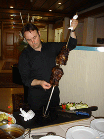 Nach einem Gruppenfoto auf der Stiege des Stadtamtes fuhren wir zum vorletzten Ziel unserer Reise, dem Hotel/Ristorante Primavera in Godega di Sant`Urbano. Hier wurden wir im Freien unter einer Zeltdachlounge mit ausgesuchter Höflichkeit willkommen geheißen. Natürlich mit etlichen köstlich zubereitenden Snacks, dazu Prosecco, Grappa und alkoholfreie Getränke. Zu diesem Zeitpunkt wussten nur die eingeweihten Reiseleiter, was uns in den kommenden drei Stunden erwarten würde. Nach Vertilgung aller Snacks wurden wir in den für uns reservierten Speisesaal des Dreistern-Restaurants gebeten und vom deutsch sprechenden Personal begrüßt. Nach Eröffnung durch Reiseleiter Erich wurde der kulinarische Höhepunkt unserer Italienreise gestartet. Insgesamt wurden ca. 12 Gänge aufgetragen, von Ruccolasalat mit Prosciutto, Lauch mit Ricotta im Blätterteig, Insalata mista Frutti di Mare, Crevetten im Coctaildip auf Krautblatt, gratinierter Jakobsmuschel über Zucchini-Ruccolarisotto, Palatschinken Tricolore mit Bechamelsauce, Gnocci alla sorrentina bis zum Hauptgang Schweinsschopfbraten vom Rost mit Rosmarinkartoffeln und Roastbeef mit Schwarzwurzel und als Ausklang Käse sowie zum Dessert Nougateis mit Karamelsauce. Zwischendurch wurden die Karaffen mit Wasser, Rot- und Weißwein aber auch Prosecco ständig aufgefüllt. Als Abschluss kam noch Grappa pur oder im Espresso zum Einsatz.