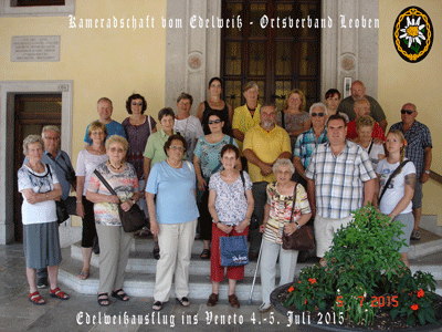 Edelweißausflug 2015 ins Veneto Unser heuriger Edelweißausflug führte uns vom 4. bis 5. Juli 2015 nach Italien, zu einem Feuerwerk an kulinarischen Hochgenüssen. Geplant, erkundet und organisiert wurde diese tolle Reise von Monika und Erich Mühlhans, die sich in Sachen Organisation und Auswahl der Ausflugsziele wieder einmal selbst übertroffen hatten. Zielsicher und souverän pilotiert wurde der Reisebus der Fa. Novak Reisen von unserem Fahrer Kurt Köchl. Überpünktlich wurde am Sammelpunkt in Leoben in aller Frühe abgefahren, da noch weitere Reiseteilnehmer in Deutschfeistritz und am Verteilerkreis Webling aufgenommen wurden. |