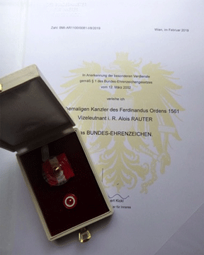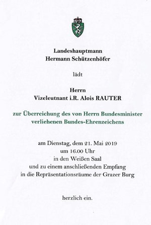 Am 21. Mai 2019 wurden nachfolgende Auszeichnungen in der Grazer Burg durch LH Schützenhofer und LR Ursula Lackner an Vzlt i.R. Alois Rauter und seine Gattin Josefine Enziger verliehen.