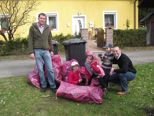 Wie in den vergangenen Jahren, beteiligte sich der Ortsverband Leoben der Kameradschaft vom Edelweiß auch heuer wieder an der Aktion „Steirischen Frühjahrsputz“. Von den Familien Thomas Kastl und Erich Landner wurde das Gelände entlang des neuen Umwelt- und Naturkundeweges (Bergmannsdenkmal – Am Sturz – Veitsberg – Tagbauteich – Seegrabenstraße) und des Baches in Leoben/Seegraben von allerlei Unrat, wie z.B. alten Kochtöpfen, Tennisschlägern oder Plastikflaschen, befreit. Auch die Kinder halfen fleißig mit und so konnten in insgesamt ca. viereinhalb Stunden 9 Müllsäcke voll Abfällen gesammelt werden.
