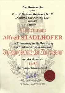 Anlässlich der Gründung des K.u.K. Husarenregimentes Nr. 16 „Kaiserin und Königin Zita“ wurde vom Regiments-kommandanten, Rittmeister i.T. Alois RAUTER, ein Gründungskreuz gestiftet. Kamerad Alois RAUTER ist langjähriges Mitglied unseres Ortsverbandes.
