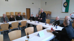 Obmann Vzlt iR Alfred Stadlhofer eröffnete um 18:00 Uhr offiziell den Kameradschaftsabend und begrüßte alle Ehrengäste und Gäste auf das Herzlichste, vor allem Landesverbandsobmann Josef Paul Puntigam mit Gattin, Bezirkshauptmann Protektor HR Dr. Walter Kreutzwiesner, den Hausherrn der Pfarre Leoben Lerchenfeld, OStR Prof. Dr. Franz Sammt, BO und Obmann ÖKB Stadtverband Leoben Heinz Lausecker mit Gattin, LO Ehrenobmann Obst aD Peter Paul Pergler und alle erschienenen Mitglieder unseres Ortsverbands. Im Zuge seiner Ausführungen und Gratulation an den Jubilar begrüßte er dann so nach und nach alle übrigen Ehrengäste die bereits Platz genommen hatten, die er anfangs in seiner Aufregung und Freude über die Feier vergessen hatte. Im Anschluss ergriff Jubilar Adolf das Wort, begrüßte seinerseits alle erschienenen Gäste und dankte für ihr Kommen. Die Gesellschaft erhob die Gläser und ließ das Geburtstagskind mit einem kräftigen Ständchen hochleben.