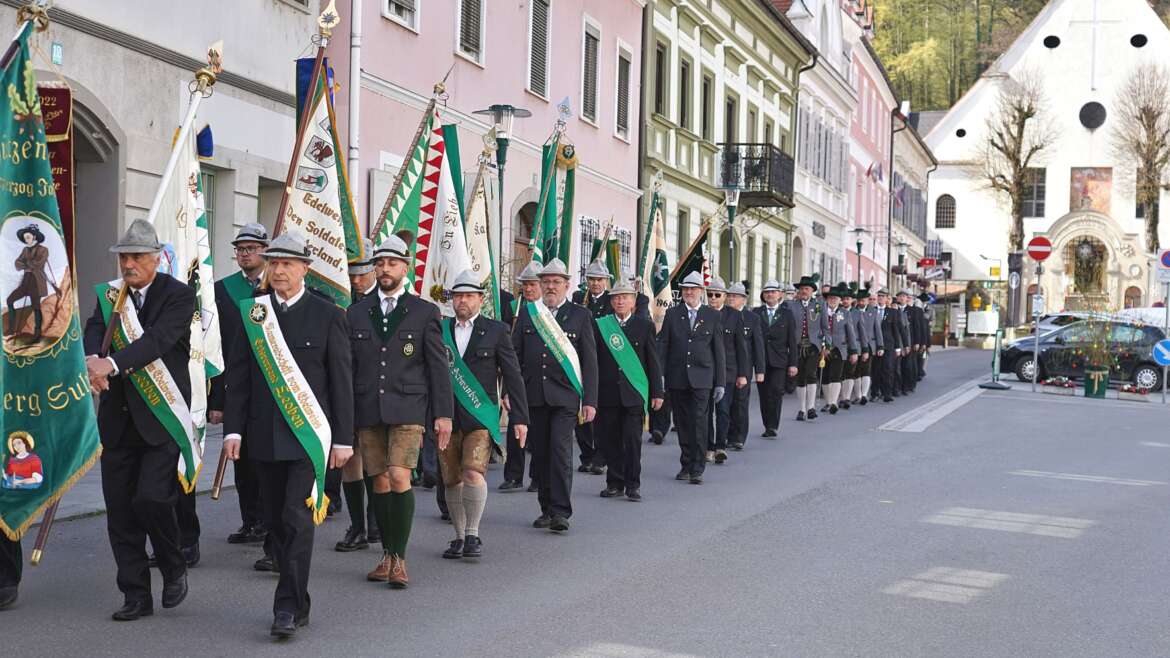 Bei strahlendem Sonnenschein sammelten sich die Ehrengäste, die Fahnenabordnungen der Ortsverbände der Kameradschaft vom Edelweiß mit ihren Vorstandsmitgliedern, eine Fahnenabordnung des ÖKB, der Schützenverein Erzherzog Johann Schwanberg-Sulmtal und die Abordnung der Marktmusikkapelle am Bauhof Bad Schwanberg.