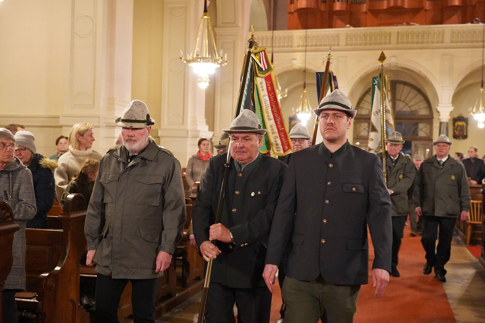 Vor der Stadtpfarrkirche wurde gesammelt und es fanden sich zahlreiche Teilnehmer, darunter der Garnisons- und Kasernkommandant von Feldbach, Oberst Günter Rath und Vizebürgermeister Christian Ortauf ein. An diesem 8. März 2025 wurde wieder mit einer Heiligen Messe den militärischen zivilen Toten Deutschlands und der Sowjetunion im gleichen Maße gemahnt, die Kaplan Yves Sevadata zelebrierte. Die musikalische Umrahmung besorgte eine Abordnung Bläser der Stadtkapelle Feldbach. Die Kameradenabordnung wurde von Kaplan Sevadata vor dem Kirchenportal abgeholt und in die Kirche geleitet, wo links und rechts im Vorfeld des Altars Aufstellung genommen wurde. Die Heilige Messe wurde vom Kaplan sehr einfühlsam und würdevoll zelebriert, die Fürbitten von unserem Protektor Bgdr iR Josef Paul Puntigam verlesen. Nach Abspielen des Kameradenliedes und Erteilung des kirchlichen Segens wurde aus der Kirche ausmarschiert und vor dem Portal Aufstellung genommen.
