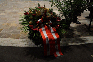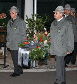 In seiner darauf folgenden Ansprache hielt Josef Schaffler fest, dass der Edelweiß - Gedenkstein in Kirchberg einen Friedensbotschafter darstellt, der jedem Menschen Anlass sein sollte zu überlegen, wann, zu welcher Zeit und in welcher Form jeder seinen eigenen Frieden mit sich und seiner Umgebung machen könnte. Als Höhepunkt der Flaggenparade wurden zu den feierlichen Klängen des Musikvereins Kirchberg die Kränze des Kameradschaftsbundes und der Kameradschaft vom Edelweiß am Gedenkstein niedergelegt. |